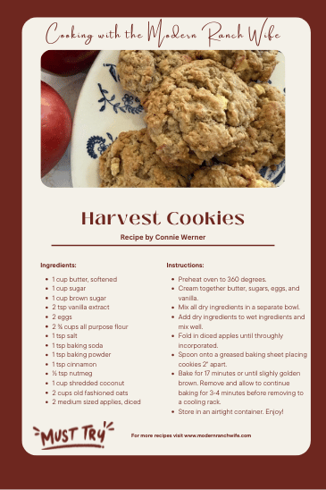 These cookies are one you must try. They were created out of an abundance of apples and the desire to make an apple pie tasting cookie. I think these fit the bill. Give them a try and see what you think. Enjoy!