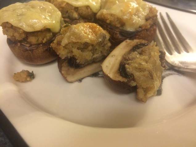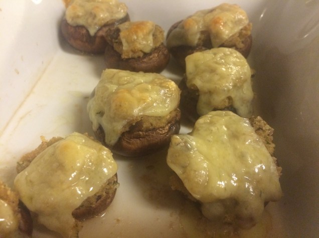 These mushrooms are filled with a stuffing like mixture, and covered with melted Gruyere cheese. They are baked in the oven with a little Chardonnay in the bottom of the pan. If you love mushrooms these are to die for!