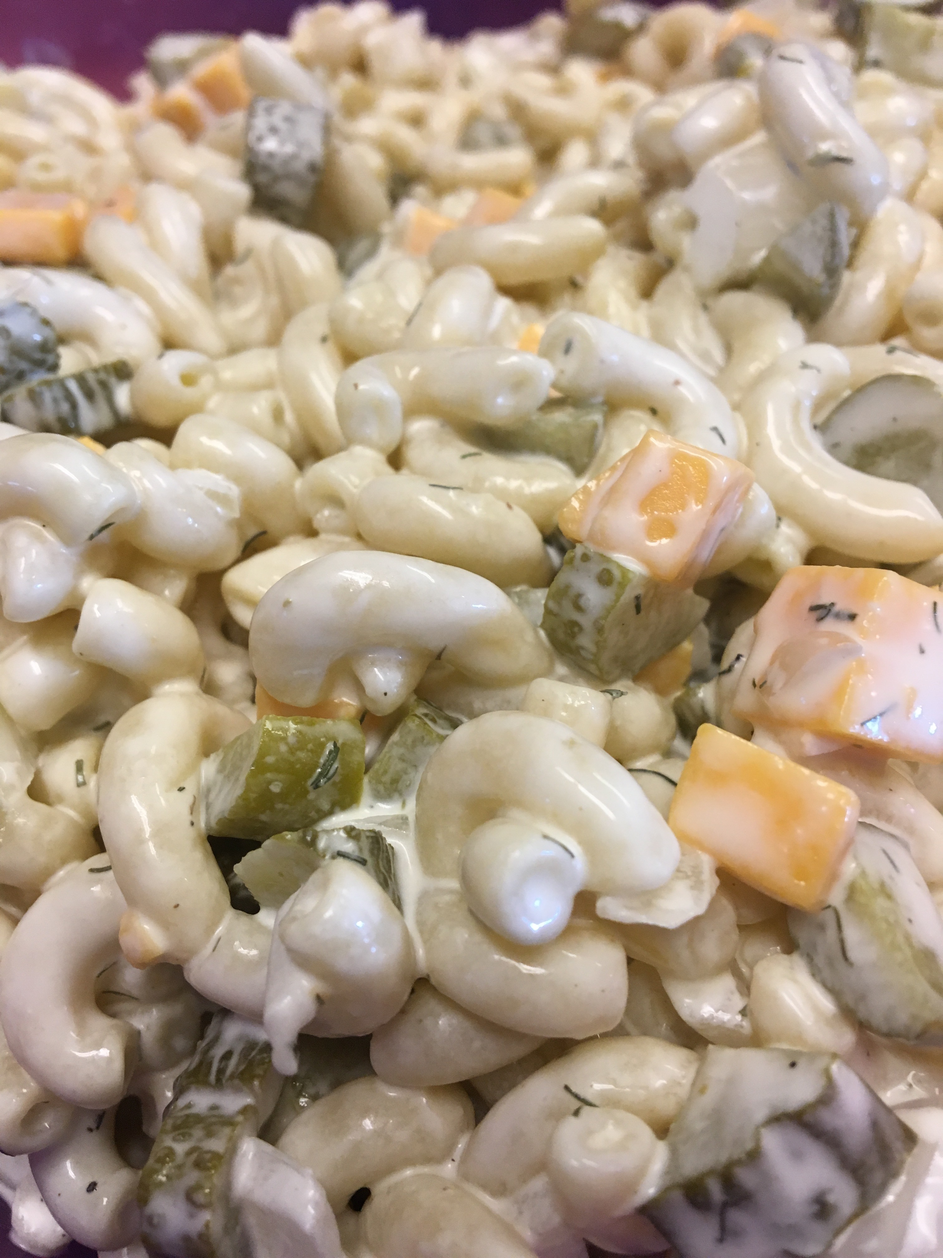 Loganne and I both love pasta salad. Especially this one. It incorporates Logannes favorite food, pickles. Yes, not just a small amount either. Dill pickles are the star of this salad.