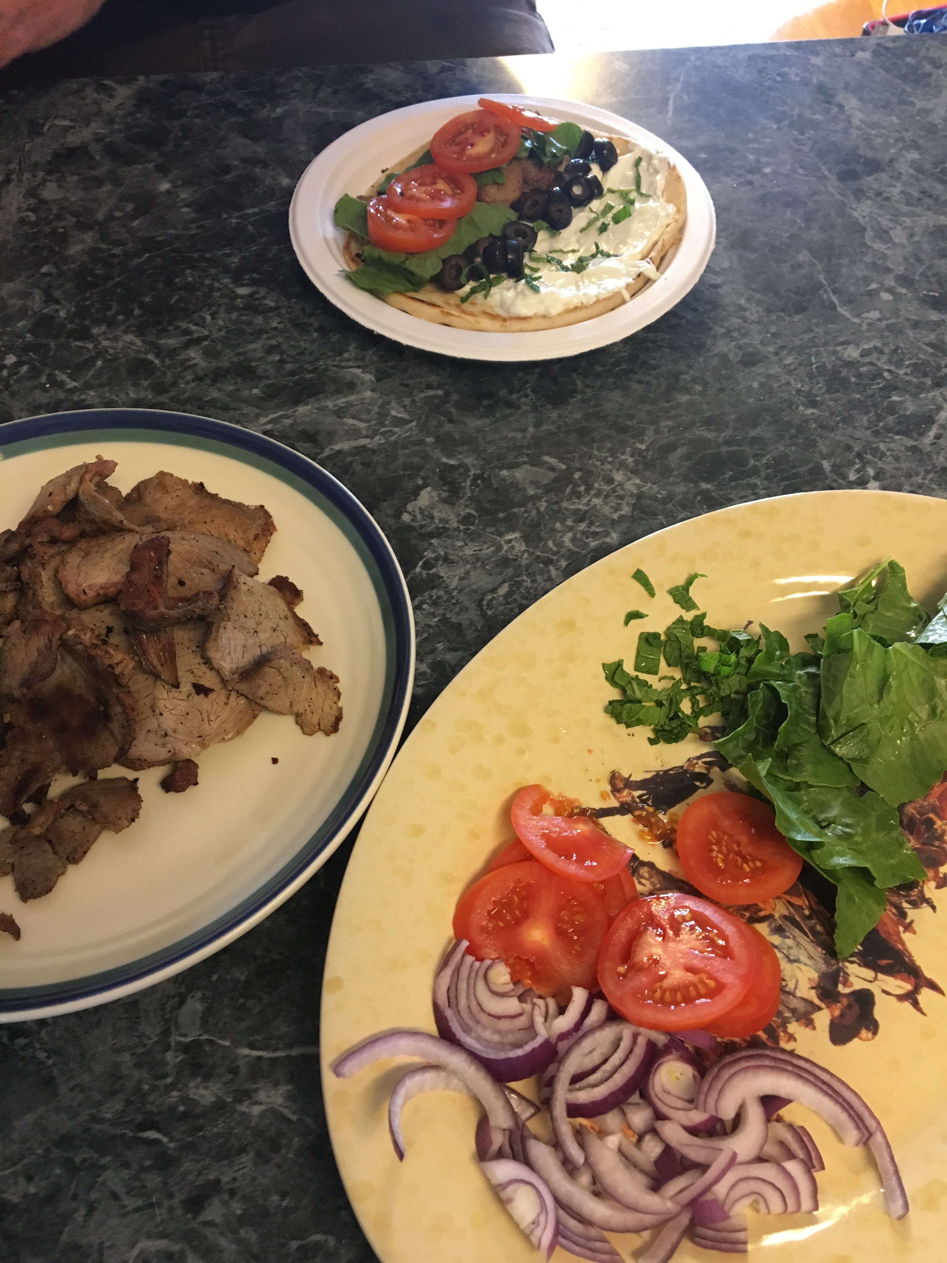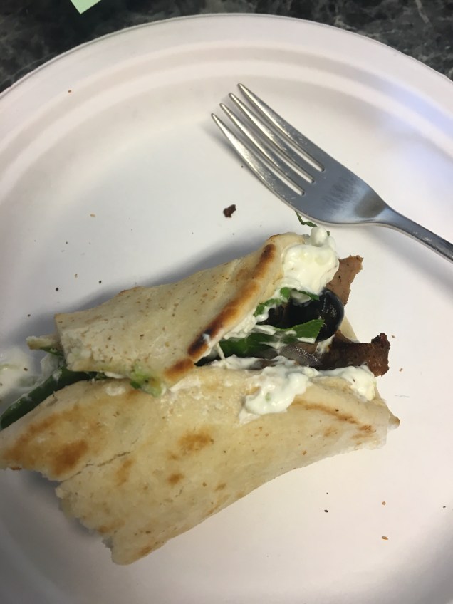 Sliced olives, lettuce, tomato, sliced red onion, oregano, mint, and the sauce all combine to make a great gyro.