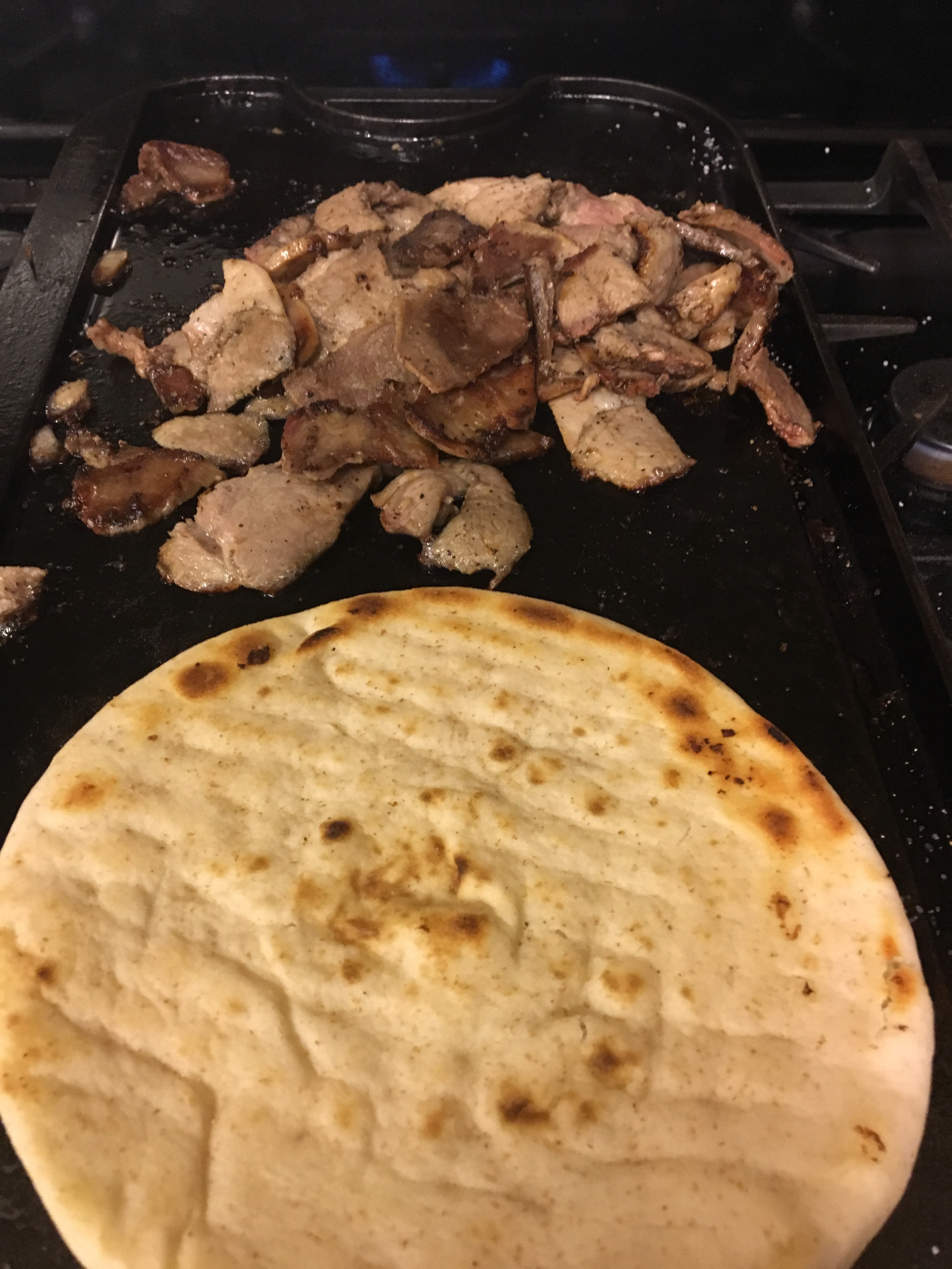 In a pan or griddle sauté the sliced lamb with a little olive oil. Sprinkle with salt and pepper. I also add a little garlic powder. In another pan or at the end of the griddle heat up one piece of pita bread turn it occasionally to keep it from burning.