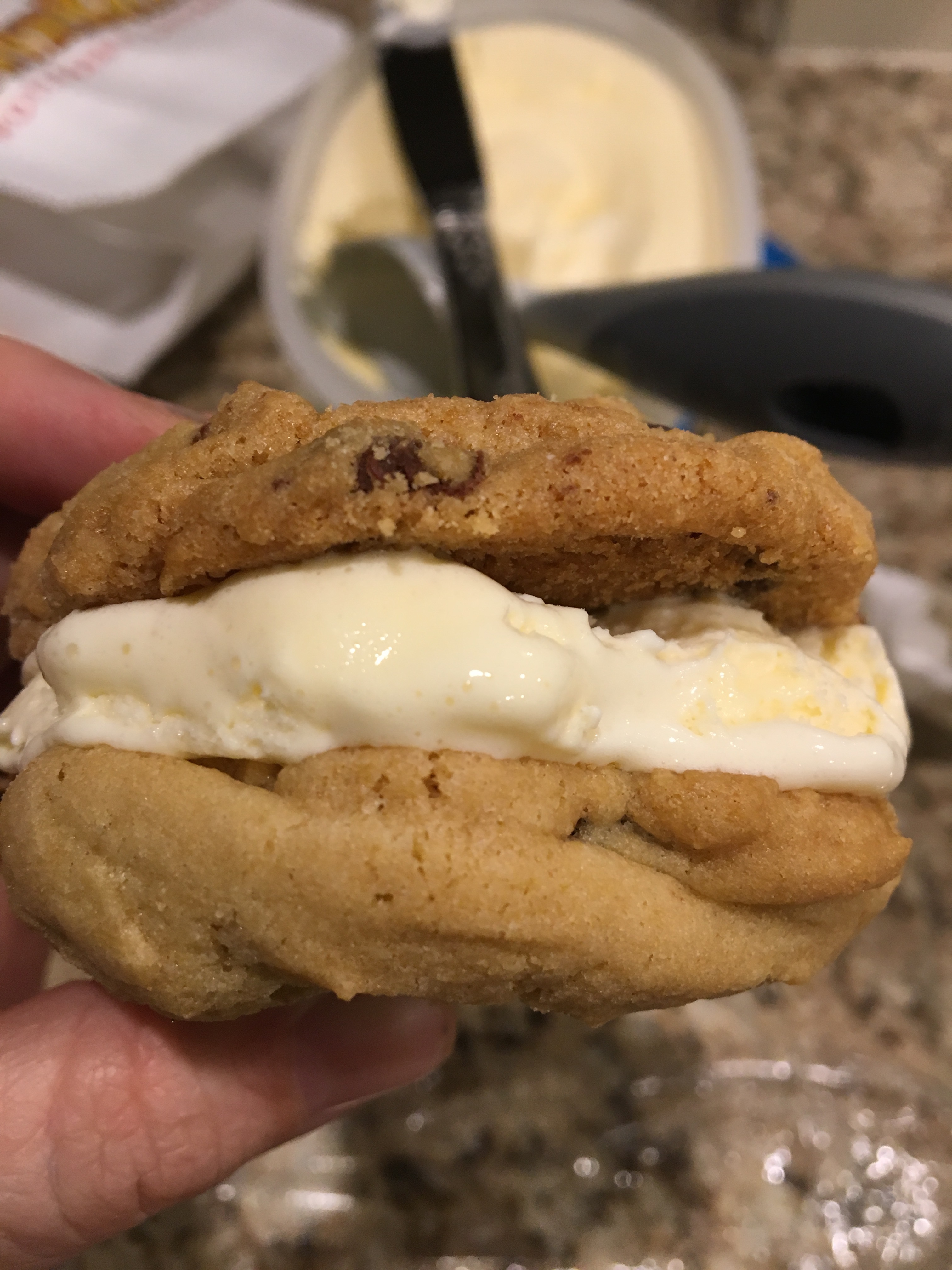 Ice cream cookie sandwiches! Yes, I put some vanilla ice cream between two chocolate chip cookies and then wrapped them in Saran Wrap. The perfect snack.