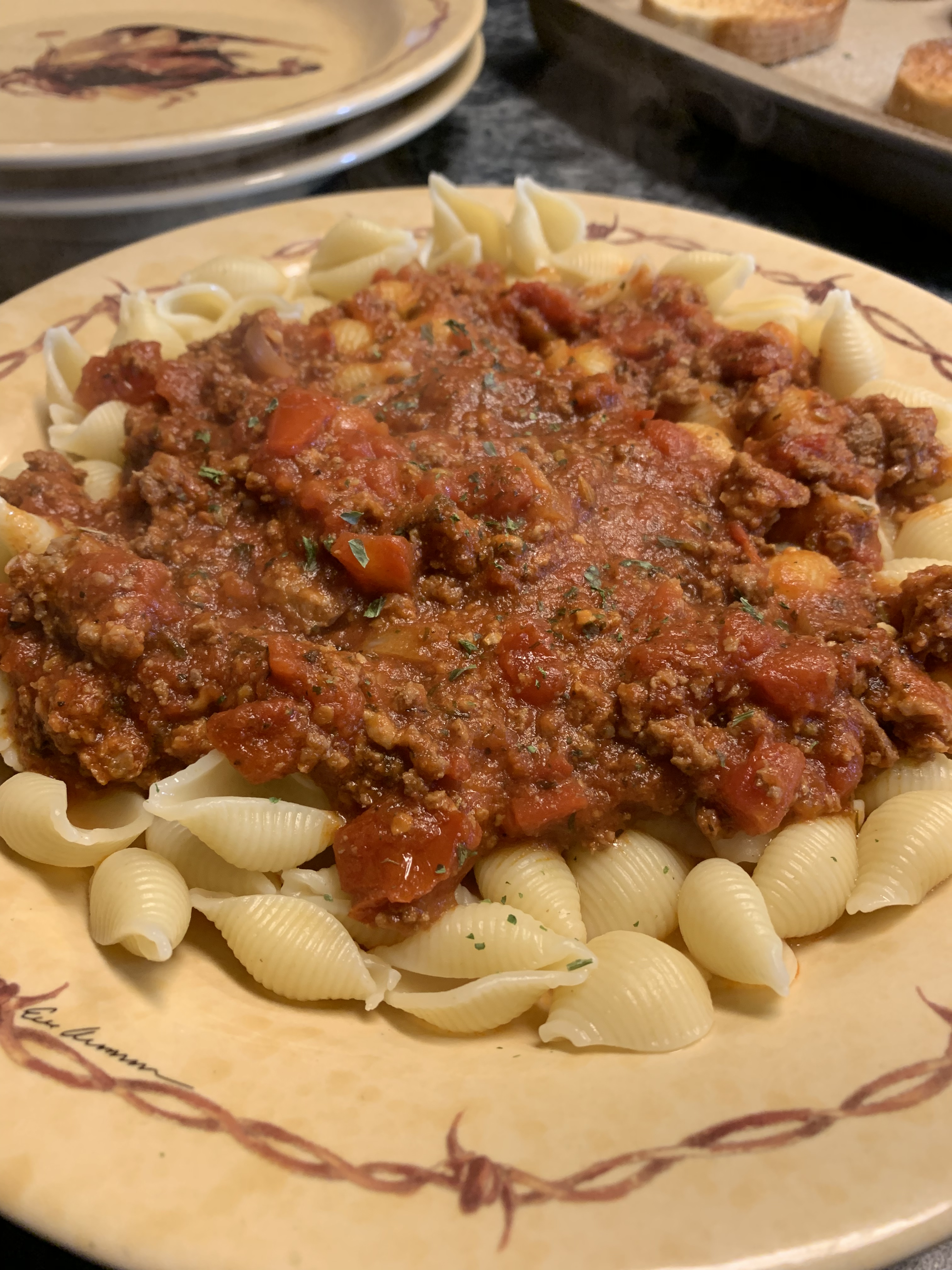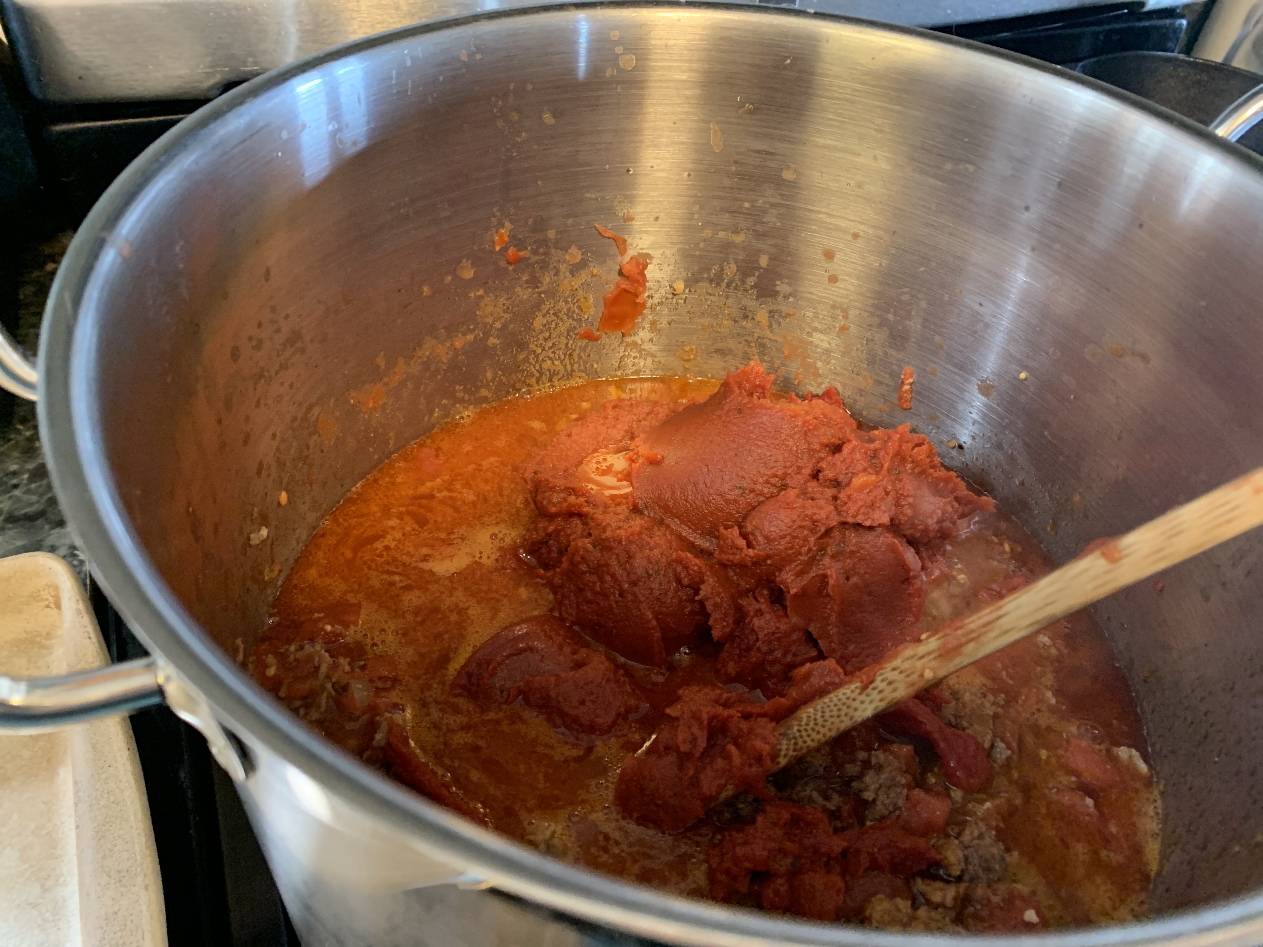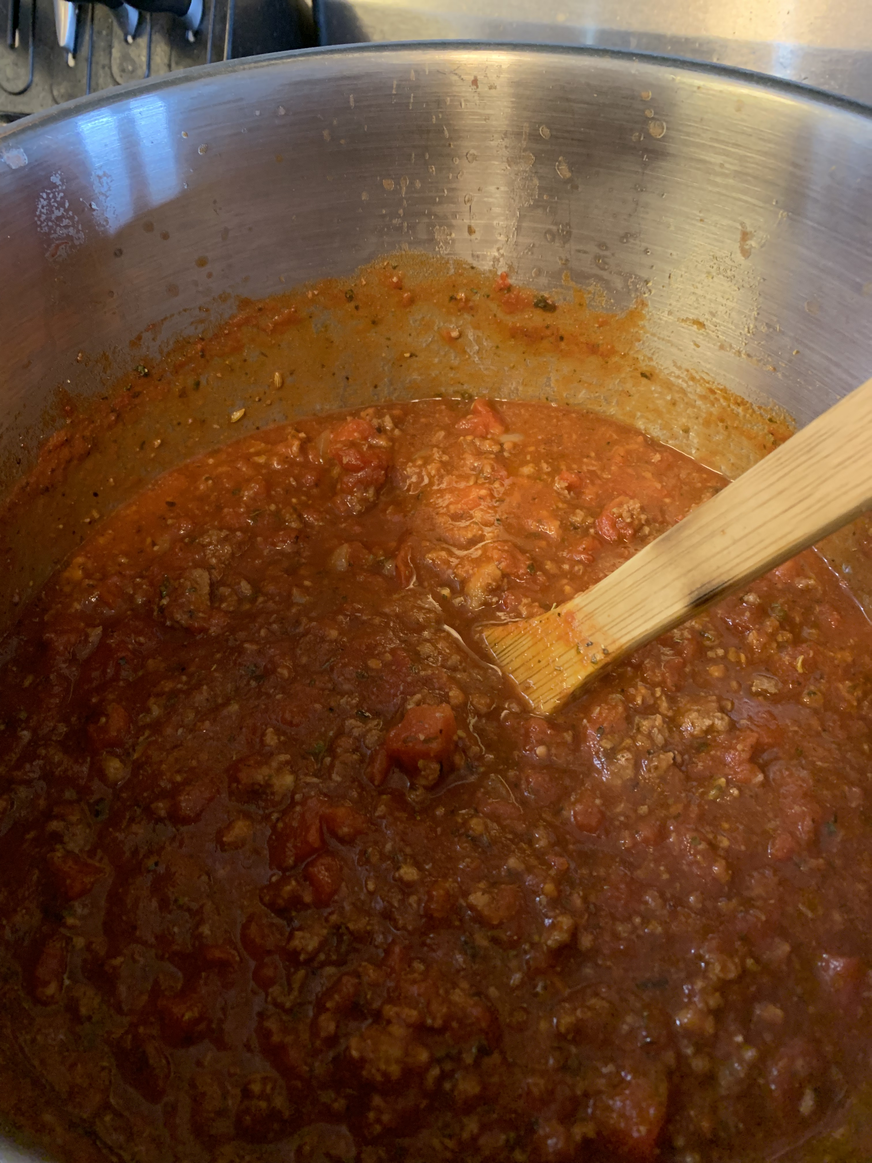It starts with browning the meats with garlic and onion. Then adding diced tomatoes that you have to crush by hand. I don’t know why but this is the way. I tried crushed and it didn’t turn out for me. I tried diced and I didn’t like that either. However open the diced and crush with your ands then add to the pot, perfect! Add spices and let that simmer for an hour!