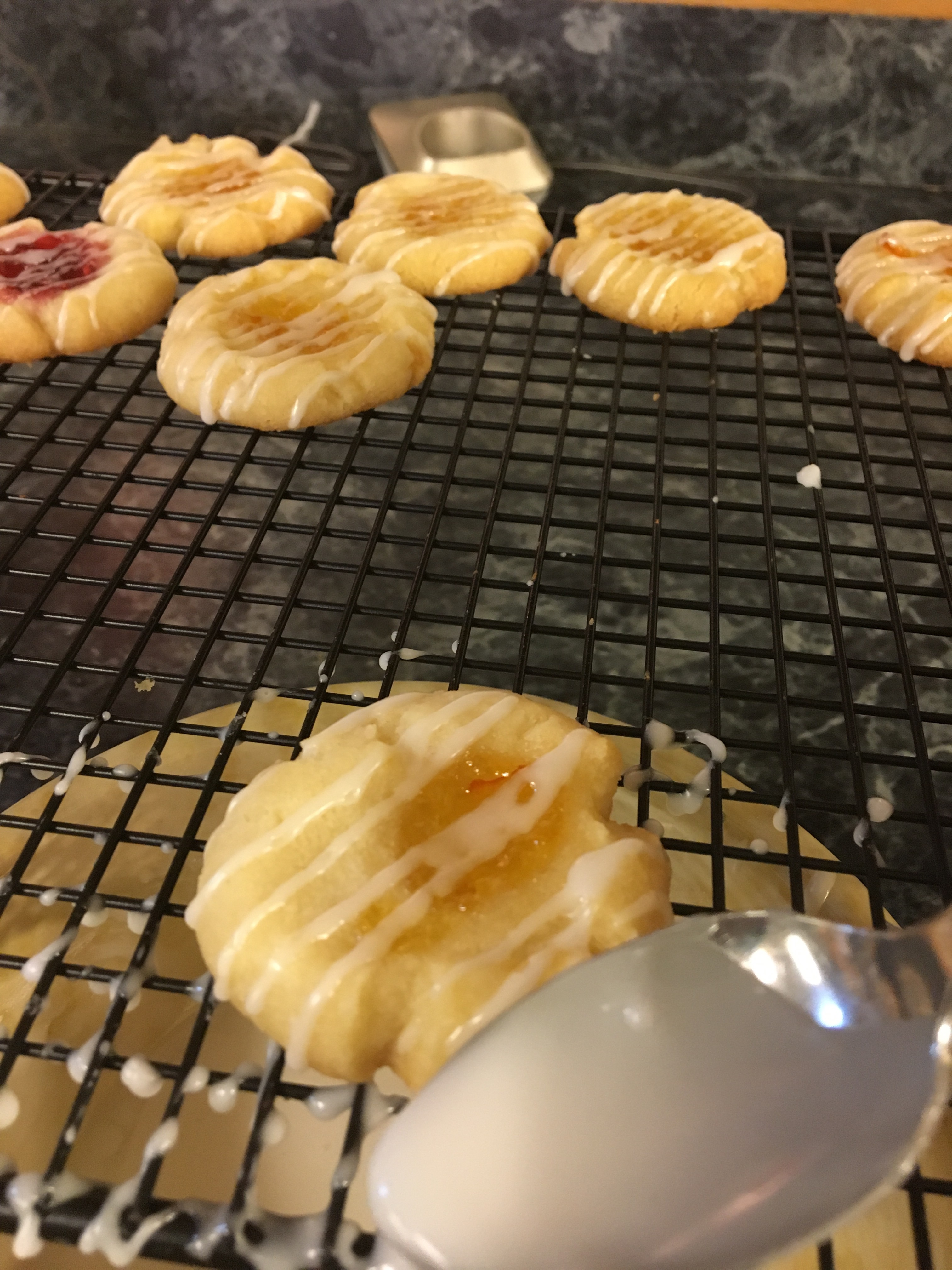 Roll dough in one inch balls and place on greased cookie sheet about two inches apart. Use a finger to make an indentation. Using a small spoon place about 1/4-1/2 tsp of desired jam into the indention.